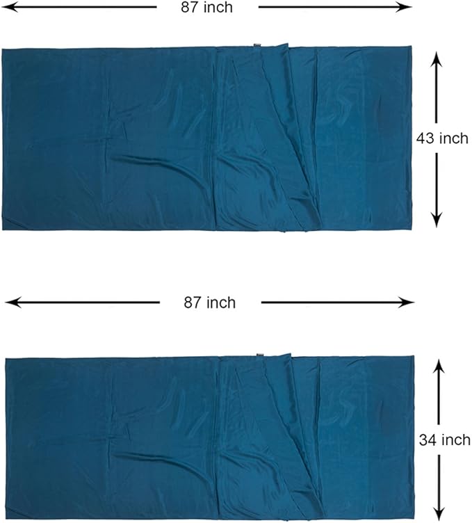 - EXTRA WIDE AND SUPER LIGHTWEIGHT: Two sizes for option: 87”x43” is an extra wide size, which is about 9” wider than a normal single liner. There’s generous space for the tall people to move freely. It weighs only 6.3oz. (180g); The 87"x34" liner weights 5oz. (140g), which is a comfortable size for one person. The liner is compacted in a tiny ripstop nylon stuff bag. With an attached hook on the carry case, you can link it up with the liner after taking the liner out, avoid losing the stuff bag.