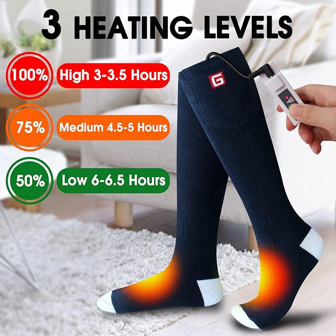 - ⛷Rechargeable Battery 3 Levels Temperatures Setting: Electric thermal insulated heated socks men are powered by a pair of 3.7V rechargeable Li-ion batteries (INCLUDE), heating temperature up to 125°F, heating area from instep, 3 adjustable heat settings for different temperature demands. Battery powered heated socks can work up to 6.5 hours after fully charged in the lowest settings. Choosing the right temperature can effectively avoid burns, blisters and other phenomena.