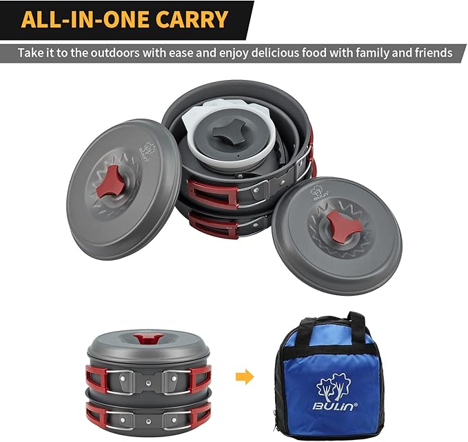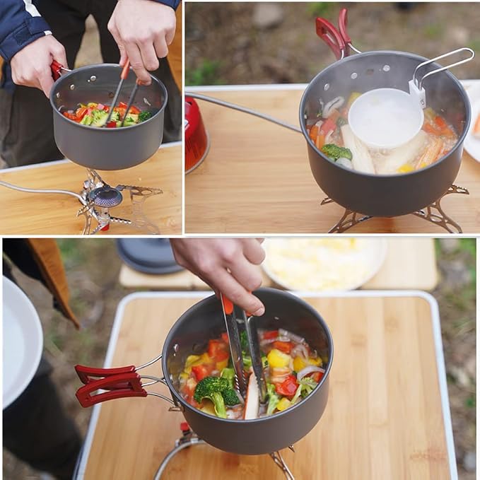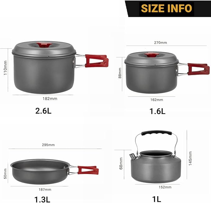 - Complete 3-4 Cookware Sets:Our backpacking cooking set includes 2 pots with lids,1 frying pan, 1 kettle,4 BPA -free bowls,2 BPA Free plates,1 BPA Free foldable soup spoon, 1 rice ladle, and 1 cleaning sponge. Ideal for 2-4 person.You can enjoy delicious food with your lover anywhere.Best money ever spent.