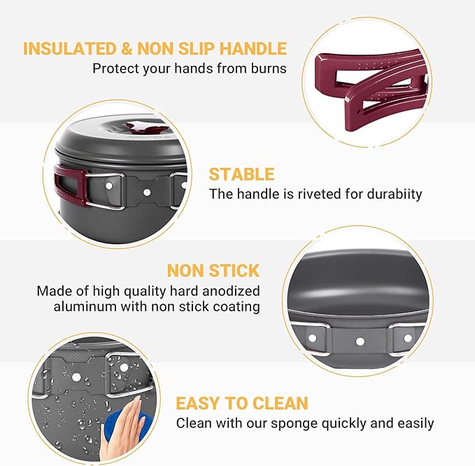 - Food-grade Material:The camping mess kit is made of safe, non-toxic aluminum with non-stick coating for easy cleaning. Hard-anodized aluminum conducts heat quickly,stand high temperature, corrosion-resistant, rust-free,built to last. Heat-resistant handles to keep your fingers safe from the heat.Secure and anti-scald.