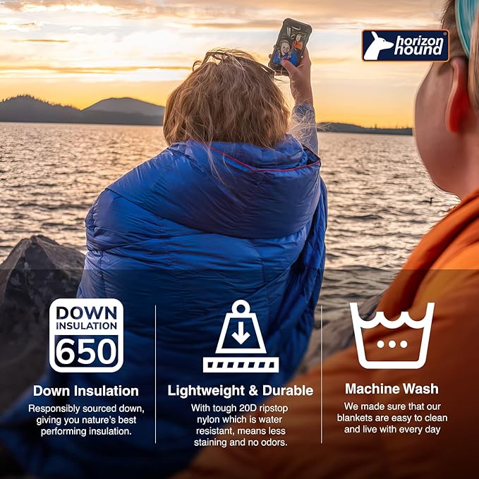 Horizon Hound Down Camping Blanket - Outdoor Travel Blanket | Sustainable Insulated Down | Lightweight & Warm Quilt for Camping, Stadium, Hiking & Festival | Water Resistant, Packable & Compact