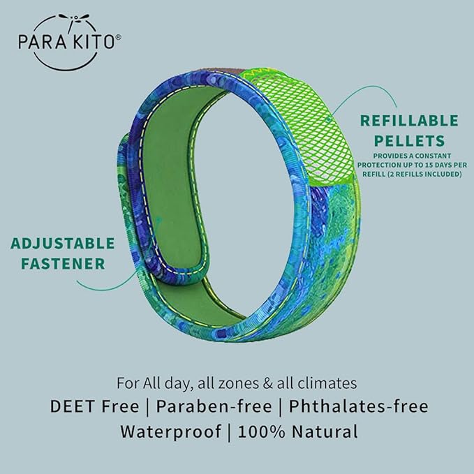 - WATERPROOF & REFILLABLE: All day, all zones, all climates! Whether you are strolling through a forest or snoozing on a tanning bed, PARA’KITO wristbands provide constant protection for 15 days per refillable pellet (2 pellets Included).