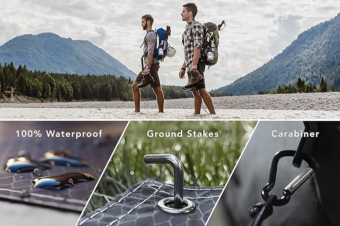 - Includes ground stakes that fit through the grommets on the blanket's corners; Clip-on carabiner holds the bag to your backpack or belt