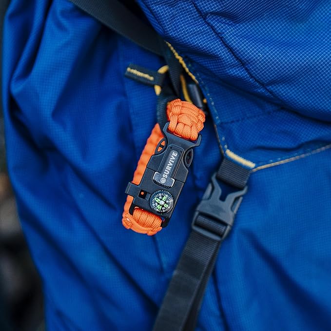 - MULTIFUNCTIONAL: Paracord can be used for shelter, secure your items on your bag, or to set traps. Fire Starter to light a fire for cooking and warmth. Compass for navigation & orienteering. Whistle used to be heard from far distance, helps to be found easier by rescuers.