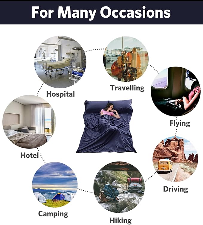 - 【Function of Sleeping Bag Liners and Complete with Pillowcase】: sleeping bag liners are breathable and comfortable, which is ideal to bring to hotels, youth hostel, or anywhere else you might travel. Take comforter off bed and use this to sleep in and it will give you a sense of cleanliness. You can use this versatile travel sleeping bag liners inside your sleeping bag to keep it clean, or use as a stand-alone sleep cover or sleeping bag in very warm climates