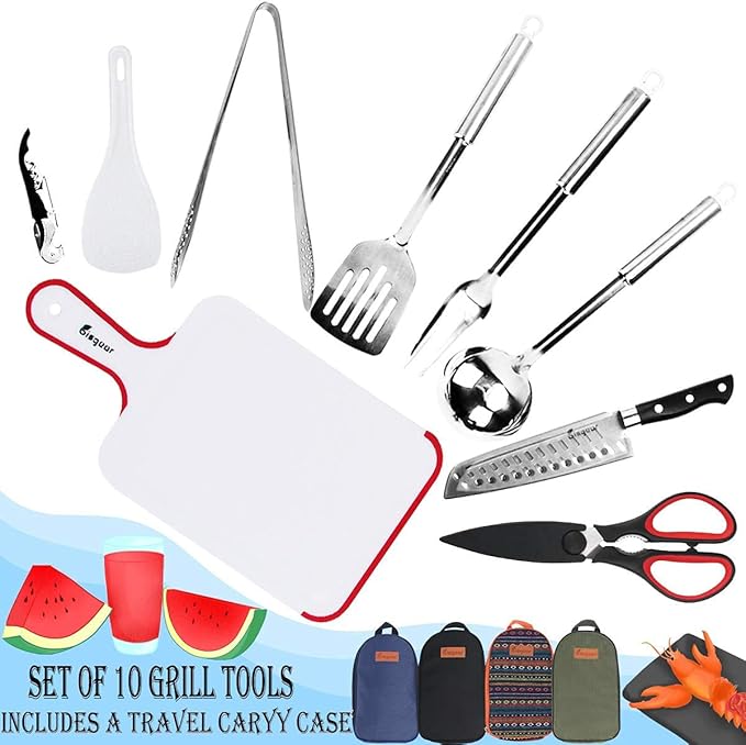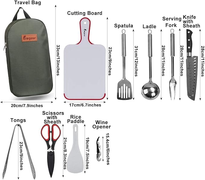 - UPGRADED COMPACT ORGANIZER: Neatly organizes and holds your utensils in one convenient place. Each utensil has its own designated pouch, so units don’t get smeared, scratched or damaged in storage or in transit. This 10PCs set includes: Serving Fork,Scissors with Sheath, Utility Knife with Sheath, Cutting Board, Spatula, Wine Opener, Tongs, Ladle, Rice Paddle