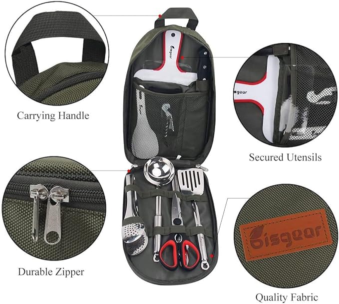 Bisgear Backpacking Camping Cookware Camp Kitchen Utensil BBQ Organizer Travel Mess Kit with Water Resistant Case, Cutting Board, Rice Paddle, Tongs, Scissors, Knife, Spork