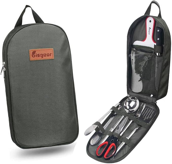 - MULTIPURPOSE: The trendy kit can be used for multiple applications, perfect for camping, sporting events, hiking, boat rides, mountaineering, BBQs, and more. The weather retardant travel utensil kit is the perfect camp kitchen accessory, and it holds all your essential outdoor cooking utensils.