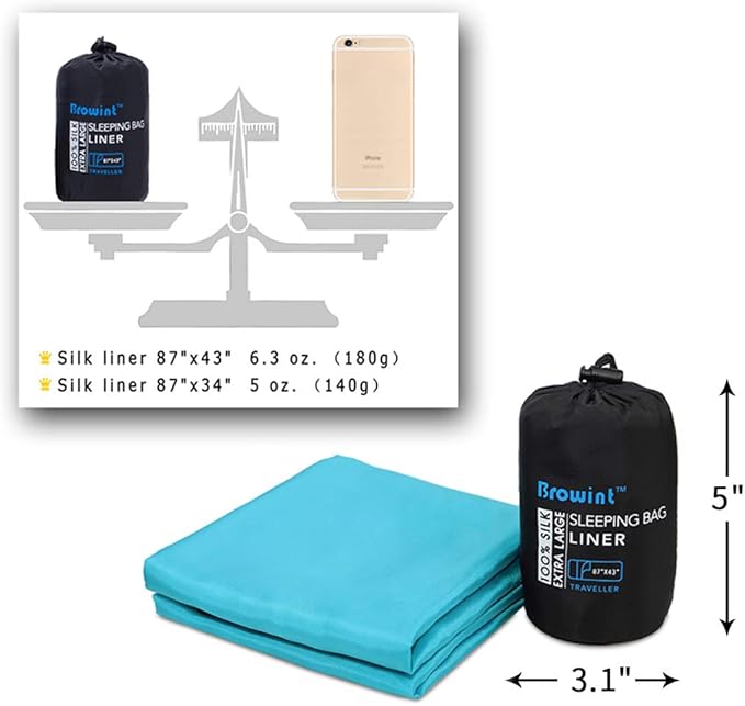 - EXTRA WIDE AND SUPER LIGHTWEIGHT: Two sizes for option: 87”x43” is an extra wide size, which is about 9” wider than a normal single liner. There’s generous space for the tall people to move freely. It weighs only 6.3oz. (180g); The 87"x34" liner weights 5oz. (140g), which is a comfortable size for one person. The liner is compacted in a tiny ripstop nylon stuff bag. With an attached hook on the carry case, you can link it up with the liner after taking the liner out, avoid losing the stuff bag.