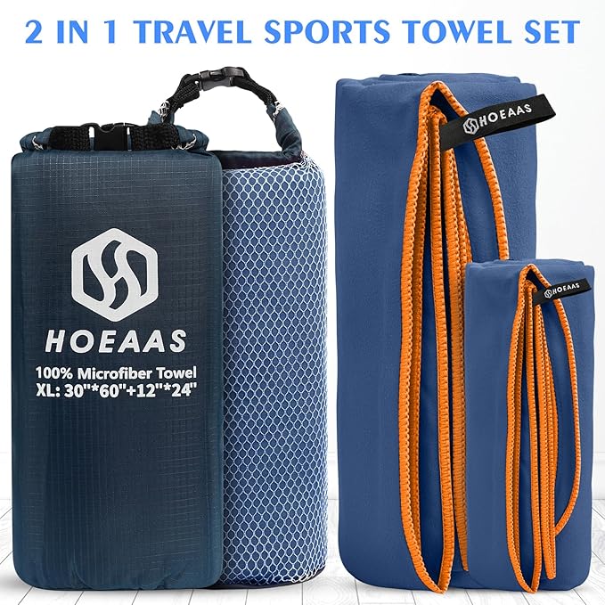 • GREAT OPTIONS & EASY HANG LOOP: Each HOEAAS microfiber towels with a hanging snap loop so it is convenient hanging for quick dry anywhere without blew away. S (2pcs 32 x 16 inch) used as face towel or workout towel. M (40 x 20inch+24 x 12inch) is perfect for sport towel to around your neck. L (48 x 28inch+24 x 12inch), used as bath towel or gym towels. XL(60 x 30inch+24 x 12inch) and XXL towel (72 x 32inch+24 x 12inch) is an ideal choice for yoga mat or beach blanket, perfect for pool and beach.