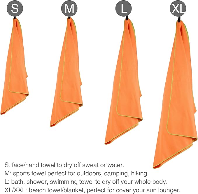 - GREAT OPTIONS & EASY HANG LOOP: Each HOEAAS microfiber towels with a hanging snap loop so it is convenient hanging for quick dry anywhere without blew away. S (2pcs 32 x 16 inch) used as face towel or workout towel. M (40 x 20inch+24 x 12inch) is perfect for sport towel to around your neck. L (48 x 28inch+24 x 12inch), used as bath towel or gym towels. XL(60 x 30inch+24 x 12inch) and XXL towel (72 x 32inch+24 x 12inch) is an ideal choice for yoga mat or beach blanket, perfect for pool and beach.