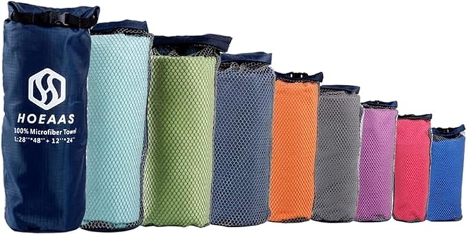 - SUPER ABSORBENT & QUICK DRYING: HOEAAS microfiber camping towel is made of soft and skin-friendly microfiber fabrics, which super absorbent and fast drying. Soaks up 5X its weight in water and dries nearly 10X faster than cotton towel, repeat use it a short time, no bad odors. So you never have to worry about your microfiber beach towels soiling or stinking up the rest of your gear. After dry your sweat or body water, Spread out or hang up the quick dry towel will be dry in minutes!