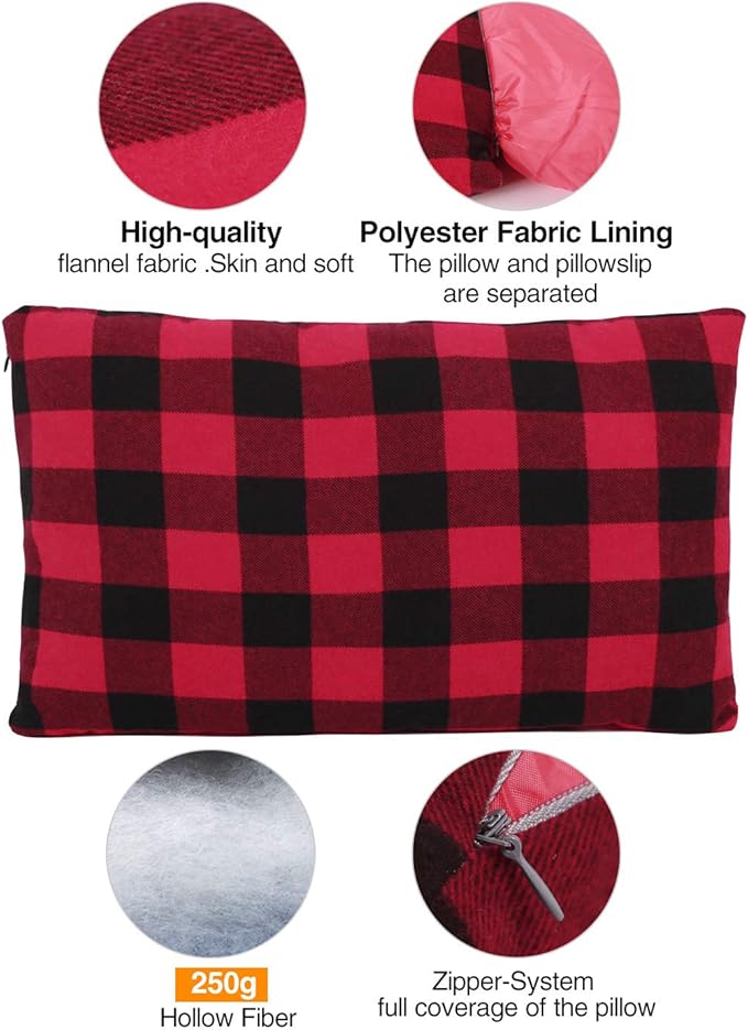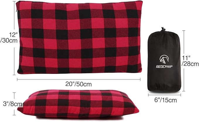 REDCAMP Small Camping Pillow Lightweight and Compressible, 1PC Flannel Travel Pillow with Removable Pillow Cover (Red and Black Plaid)