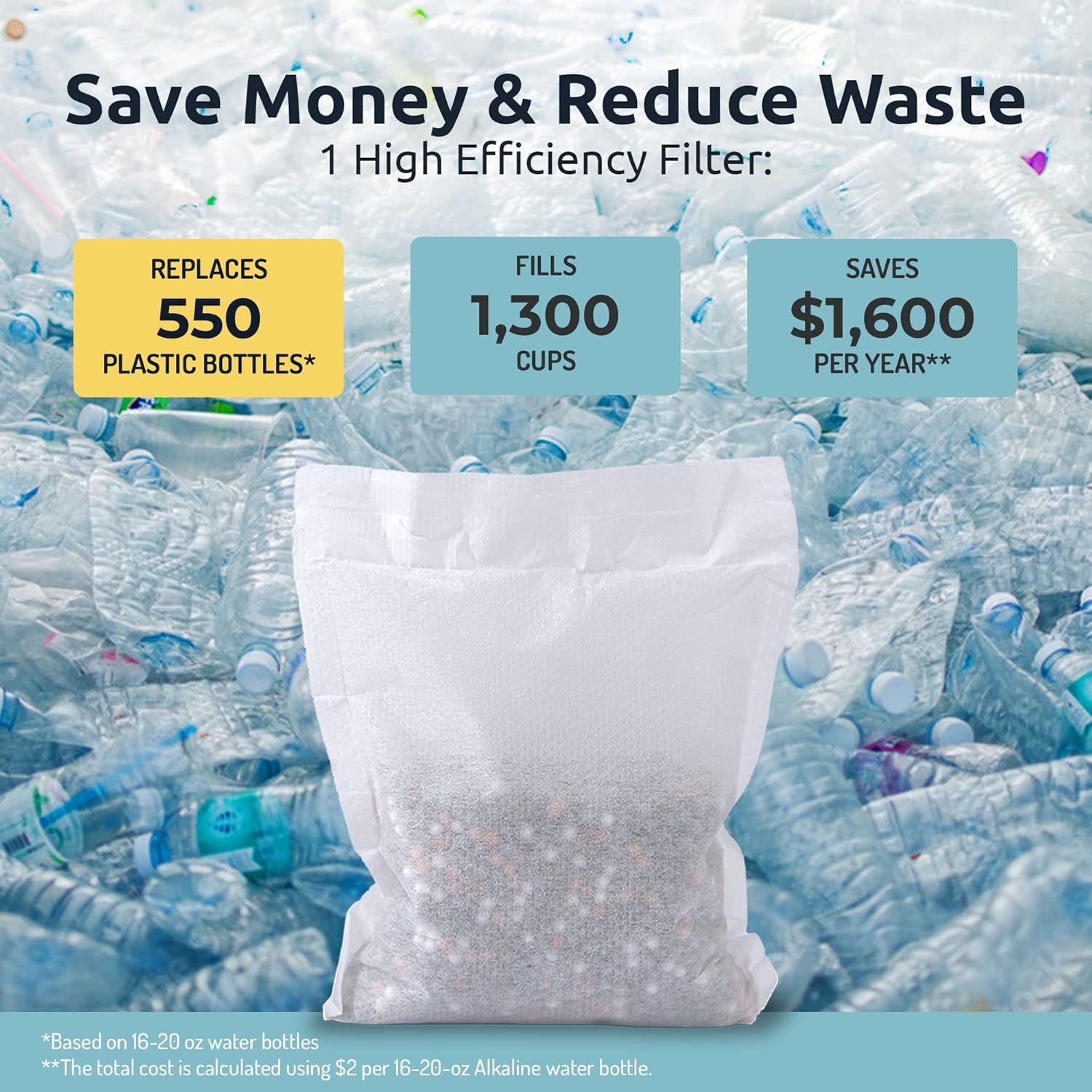- HUGE FILTER CAPACITY - Each ph On-The-Go Filter Pouch can filter up to 1700 cups / 400 litres / 105 gallons of water. You can use it with Invigorated water bottles, pitchers or any other jug or bottle of your choice. The pouch can last for a lifetime of 50 days with an average consumption of 8 glasses per day. An affordable solution to keeping yourself and your family healthy!