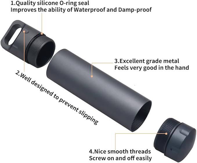 - The handy high capacity capsule/cylinder is screwed with rubber O-ring seal and long fine threads on the end caps which make it 100% Waterproof, the nice threads are extremely smooth, it screw on and off very well and won't open accidentally