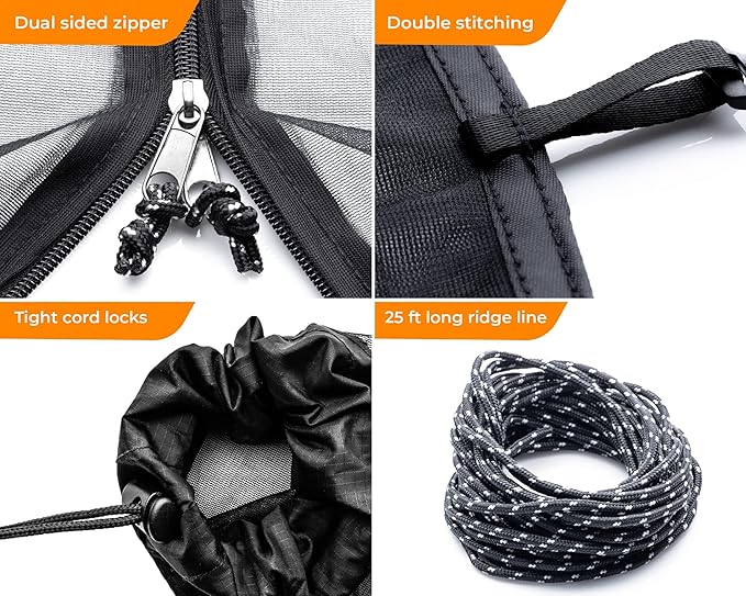 - SIMPLE SET UP: Foxelli Hammock Net comes complete with everything you’ll need to easily set up your hammock net cover in just seconds. An extra-long ridgeline is included (25 feet), as well as a convenient dual sided vertical zipper for easy in and out access, which are all must have accessories for any hammock camping set.