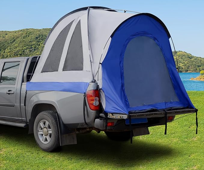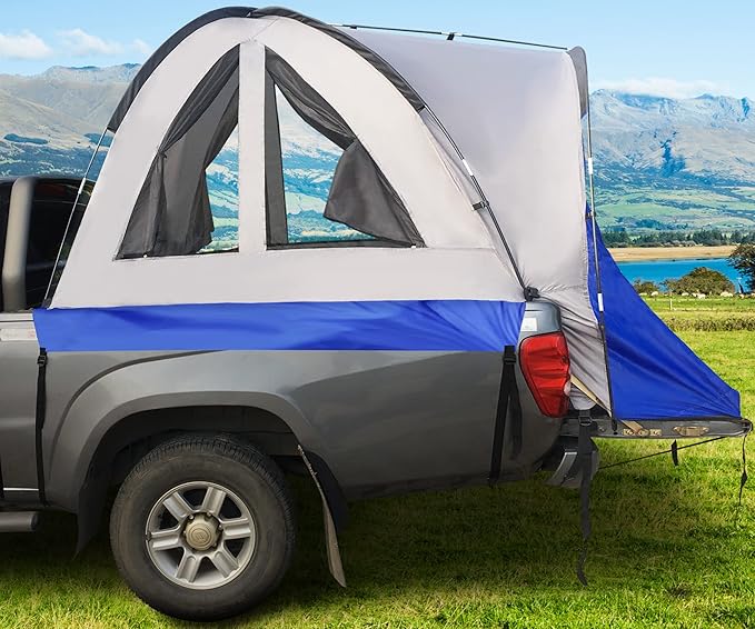 - Great Ventiltion:The 5-6.5 ft truck bed tent has 2 mesh windows,double-layer design, you can take off the out canopy in cloudy day for getting more fresh air and breezy.And put the canopy down , can effectively block the sunlight for offering a good rest. It weights 11 ounce, portable to take to anywhere.