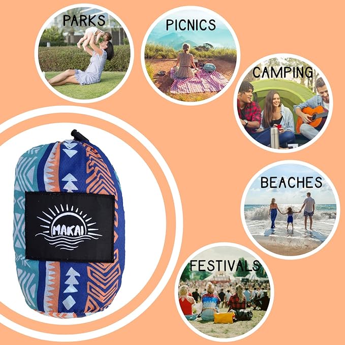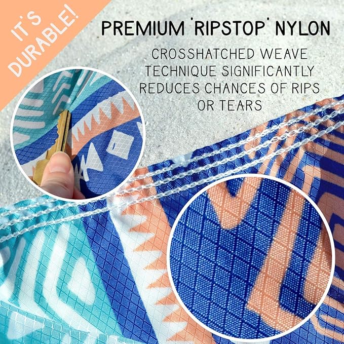 - Superior Quality MAKAI Beach Blanket: Crafted from premium 210T ripstop nylon, this sandproof beach blanket is ultra-durable, lightweight, and breathable. Unlike polyester, our material stays cool under the sun, ensuring a comfortable experience every time.