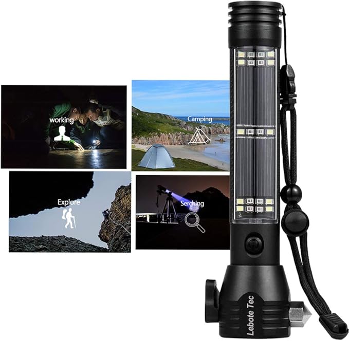 Lebote Car Flashlight Solar Power Tactical Flashlight Multi Function Flashlight Bright LED Emergency Torch Light With Safety Hammer Seat Belt Cutter Compass For Hiking Camping
