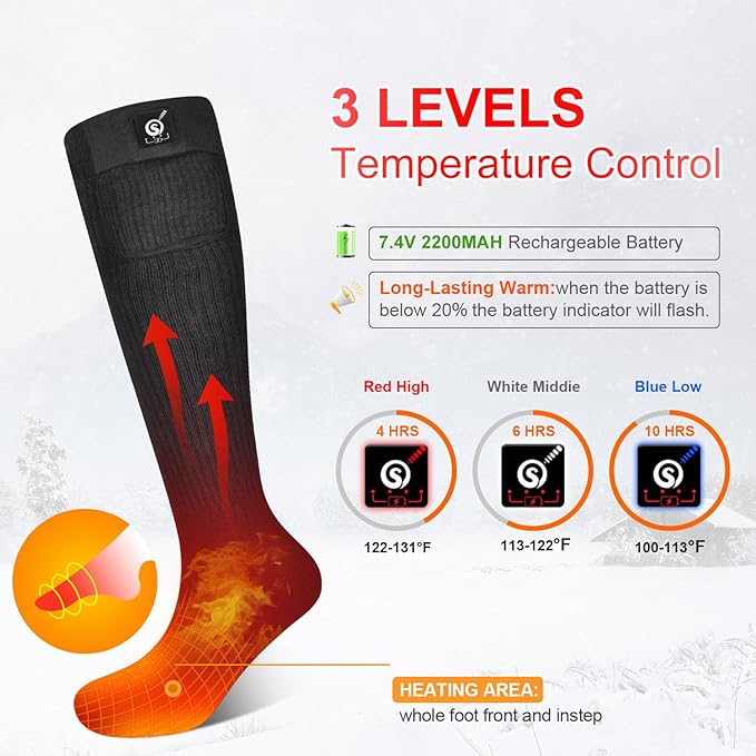 - 【7.4v 2200mah Batteries&3 Settings Temperature Controller】Battery socks powered by with 7.4V 2200mah rechargeable lithium battery packs,full charge around 3-4 hours,duration 3 - 8hours with 3 heat setting. controller LED red is for high temperature,white for medium temperature,blue for low temperature.you can easily adjust the temperature.