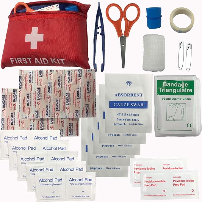 - **Comprehensive First Aid Kit**: Includes 38 essential pieces like Triangular bandage, Safety pins, PBT, Elastic bandage, Scissors, Gauze pads, Tourniquet, First-aid tape, Alcohol prep pads, Adhesive plaster, Povidone iodine prep pads, Plastic tweezers.