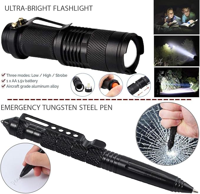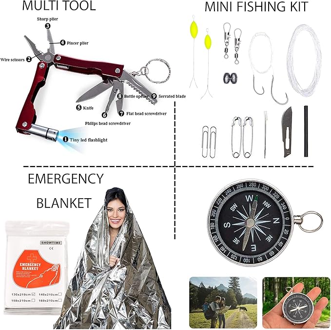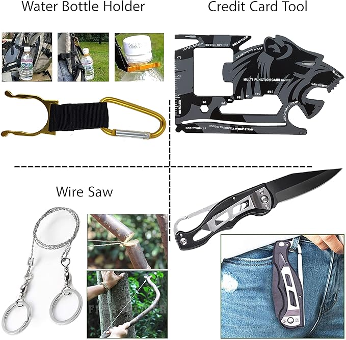 - **High-Quality Tactical Gear**: Upgraded backpacking gear includes a robust bag with Oxford fabric, Saber Card, Survival Bracelet, Foldable Knife, Mini Fishing Kit, LED Flashlight, Compass, Emergency Blanket, Bottle Holder Clip, Wire Saw, and more.