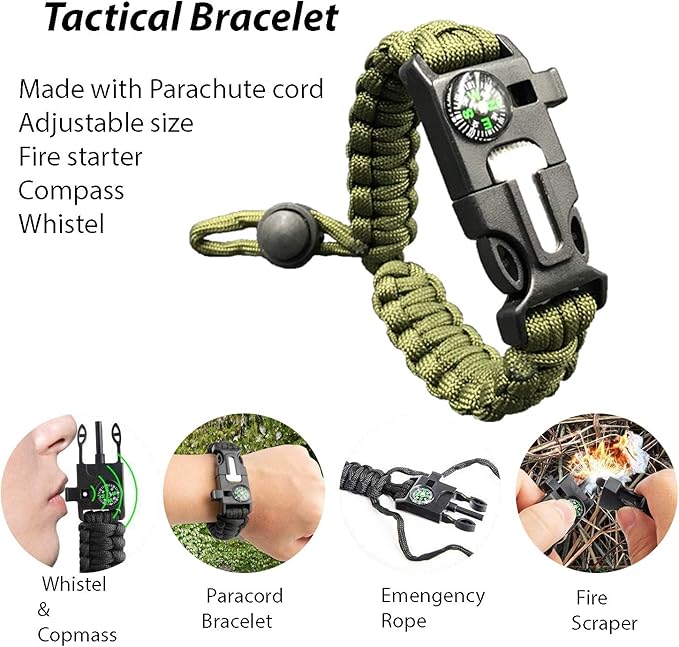 - Included Components : Emergency Blanket, Camping accesories, Tactical Bracelet, Compass, Saber Card