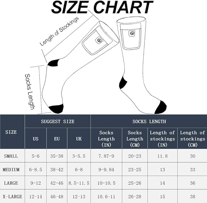 - 【High Quality After Sales Service】All our heated products have good after sale service support.If you have any problems (Size, quality, etc.), please contact us by email.Socks are available in four sizes S, M, L, XL.Please select the appropriate size according to our size chart picture.