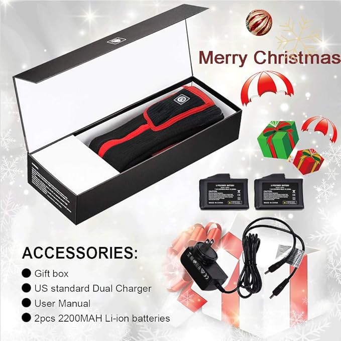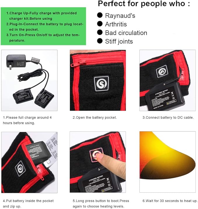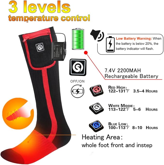 - 【7.4v 2200mah Batteries&3 Settings Temperature Controller】Battery socks powered by with 7.4V 2200mah rechargeable lithium battery packs,full charge around 3-4 hours,duration 3 - 8hours with 3 heat setting. controller LED red is for high temperature,white for medium temperature,blue for low temperature.you can easily adjust the temperature.