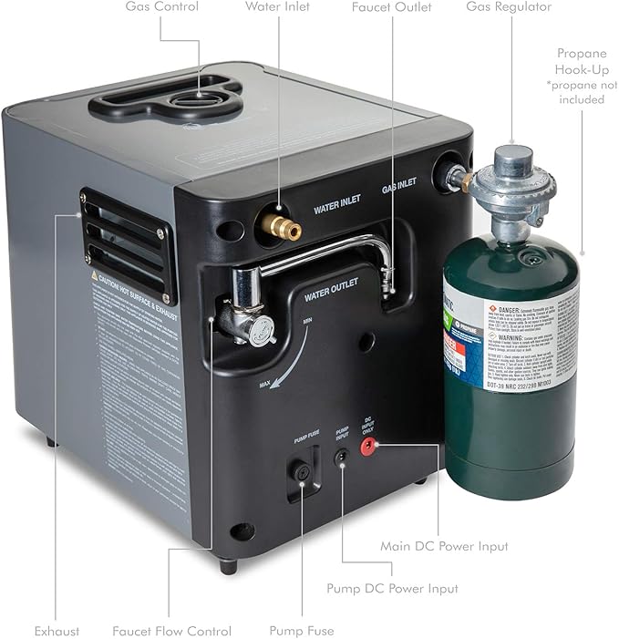 - PORTABLE OUTDOOR WATER HEATER – Innovative System Runs on Propane Gas Tank to Heat Water for Showering, Washing Dishes, Cleaning Hands & Other Tasks