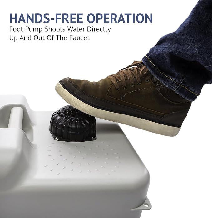 - CONVENIENT HANDS-FREE OPERATION - Innovative Foot Pump Manually Shoots 180ml Fresh Water through Faucet for Better Hygiene, Cleanliness & Ecofriendly Conservation. 19L fresh water tank provides more than 100 washes on a single fill-up.
