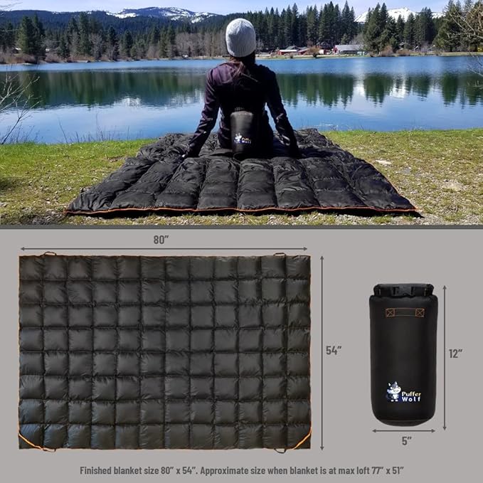 - ✅ EXTRA WARM, LARGE AND PORTABLE: Perfect for travel, the Puffer Wolf is extremely warm, durable, weatherproof, lightweight, compressible, and now wearable! Our blankets are extra large, measuring in at 80” x 54” (~77” x 51” when fully lofted), yet pack down small with the included Premium Stuff Sack (~5” x 5” x 12”), making them perfect for any adventure!
