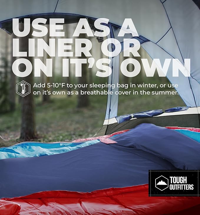- SLEEP LIKE A BABY ON THE ROAD: Say goodbye to scratchy hotel sheets and hello to your new BFF (best fluffy friend) - our XL sleeping bag liner! Soft, lightweight, and breathable, this 100% Polyester adult sleep sack is one of the most important camping essentials and will have you snoozing comfortably no matter where your adventures take you.