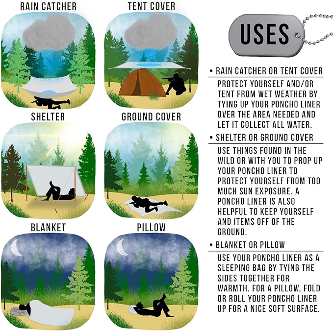 - Versatile multi-purpose design: The poncho liner military woobie can be used as a camp blanket, rain/wind protective emerency blanket, camouflage blanket, or as a traditional woobie / hoodie blanket for cold weather camping and hunting trips.