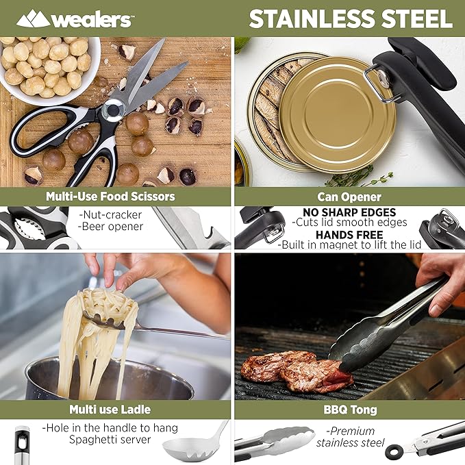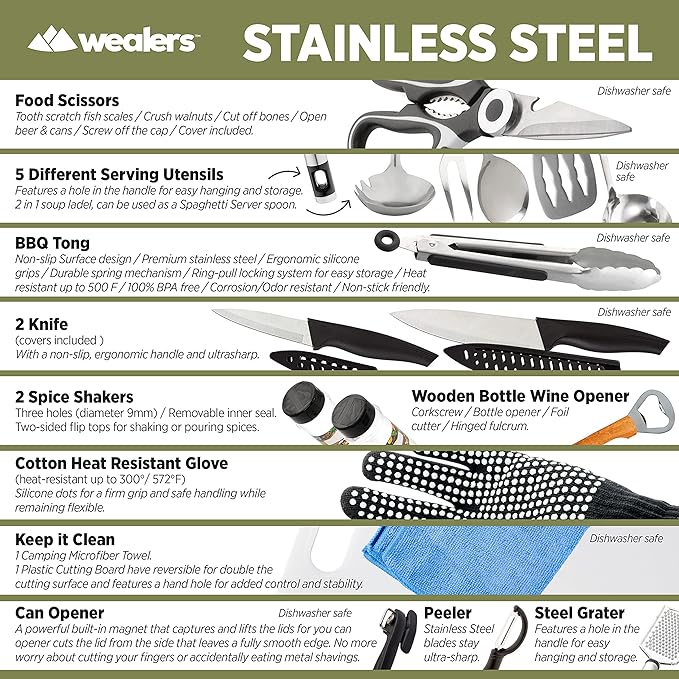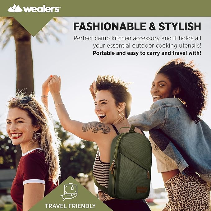 - MULTIPURPOSE: The trendy kit can be used for multiple applications, perfect for concerts, sporting events, hiking, boat rides, mountaineering and BBQ’s. The weather retardant the travel utensil kit is the perfect camp kitchen accessory, and it holds all your essential outdoor cooking utensils.