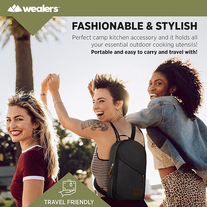 - MULTIPURPOSE: The trendy kit can be used for multiple applications, perfect for concerts, sporting events, hiking, boat rides, mountaineering and BBQ’s. The weather retardant the travel utensil kit is the perfect camp kitchen accessory, and it holds all your essential outdoor cooking utensils.