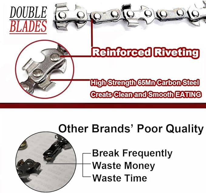 - More Blades- The High Limb Rope Chain Saw has an Upgraded 48 Inch Chain with double sided teeth on both sides-62 Sharpest Carbon Steel Teeth. Arched double layered riveted links add strength to connecting chain and stabilize flex, reducing breakage and binding