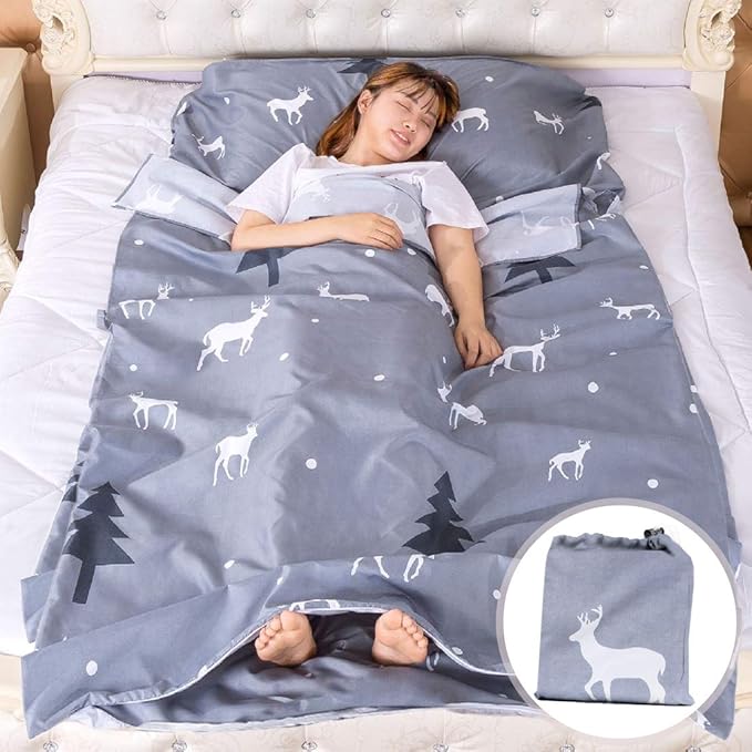- 【Function of Sleeping Bag Liners and Complete with Pillowcase】: sleeping bag liners are breathable and comfortable, which is ideal to bring to hotels, youth hostel, or anywhere else you might travel. Take comforter off bed and use this to sleep in and it will give you a sense of cleanliness. You can use this versatile travel sleeping bag liners inside your sleeping bag to keep it clean, or use as a stand-alone sleep cover or sleeping bag in very warm climates