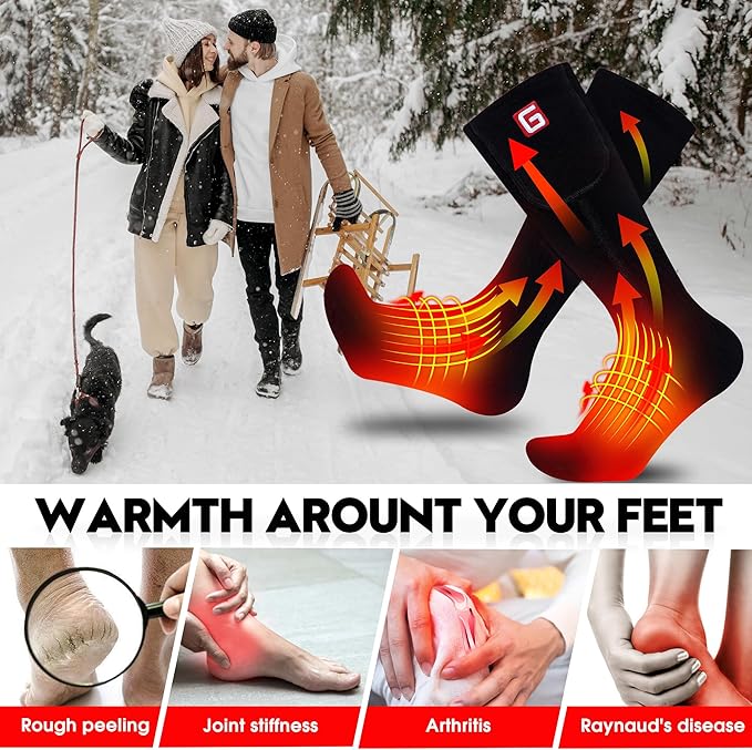 - 🔥Improve Blood Circulation: Rechargeable battery operated electric heated socks with far infrared fiber heating elements, help those who have Arthritis, Raynaud’s, Stiff Joints or chronic circulation issues, improve blood circulation and reduce soreness. Electric insulated material offers you safe thick socks, keeps your feet warm and comfortable in cold winter.