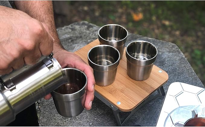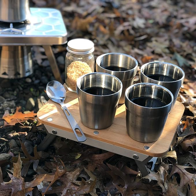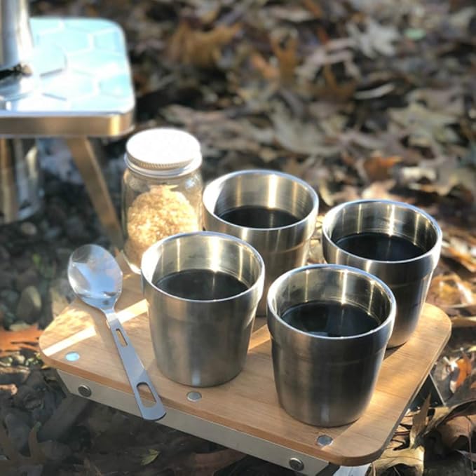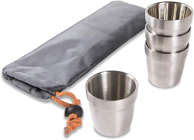 nCamp - Camping Coffee Cup Set, Insulated Stainless Steel Cups, Stackable Metal Cups, Stainless Steel Cup with Nylon Drawstring Bag, Made with 304 Stainless Steel, 6 oz, 4-Piece Set