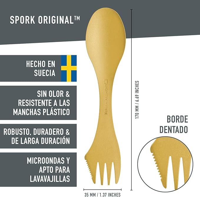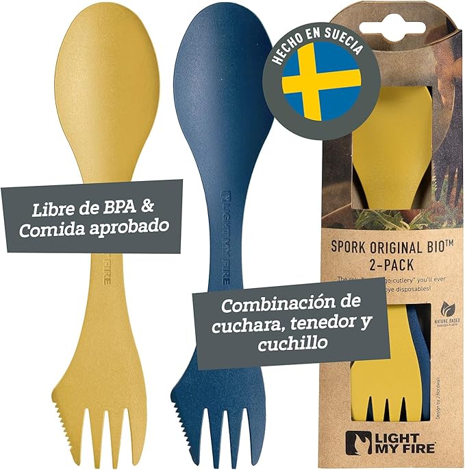 - SAY GOOD-BYE TO DISPOSABLES our camping utensil set spork is the only “on-the-go cutlery” you will ever need for eating on outdoor wilderness adventures. Starve the landfills with our responsibly made utensils. You receive 2 sporks. Mustyyellow/Hazyblue