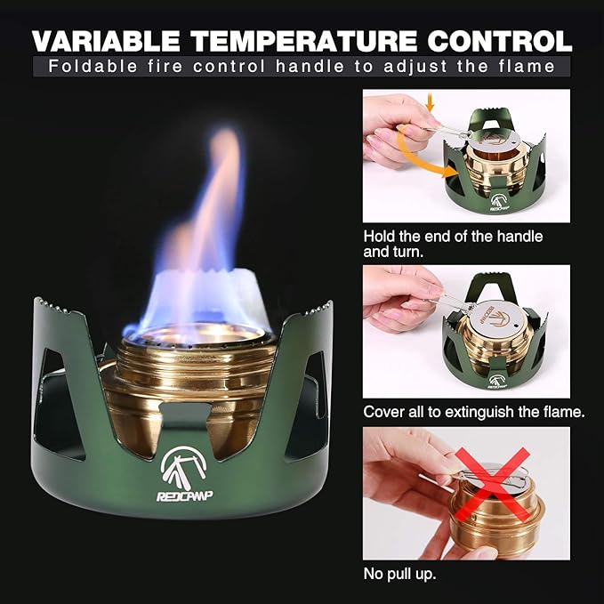- VARIABLE TEMPERATURE CONTROL: Alcohol burner stove with foldable handle on the flame regulator to control and extinguish flame, directly used with outdoor cookware. Also the rubber seal which prevents alcohol leak and evaporation