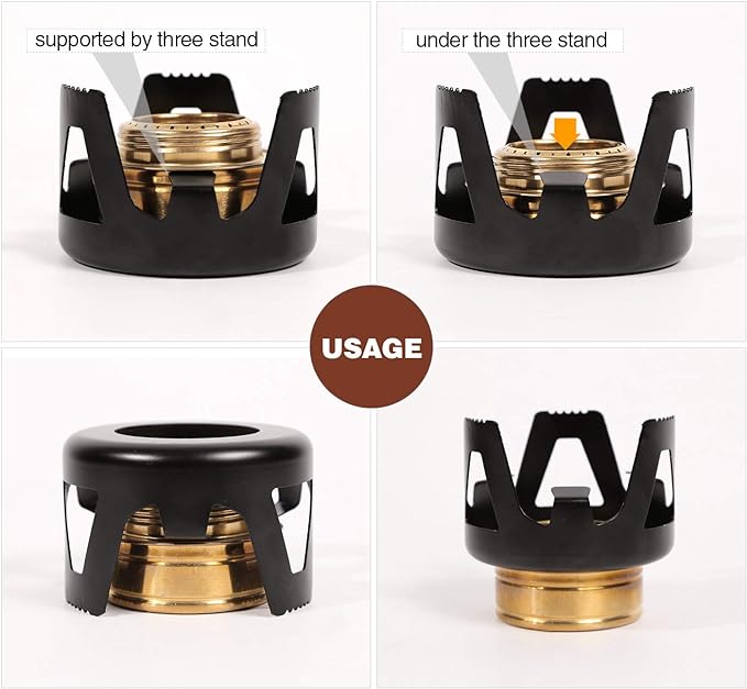 - Material: Aluminium alloy stove stand and brass stove. The base with wind screen which can keep the stove stable and support pots and pans