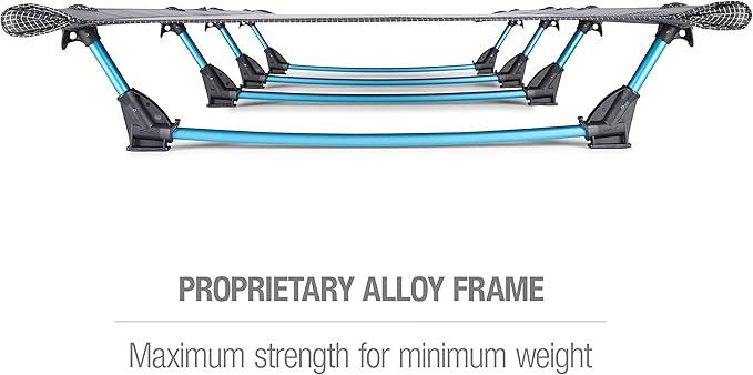 - Holds up to 265 pounds with proprietary aluminum alloy legs and frame; cot cover and zippered carrying case made from 600-weave rip-stop polyester