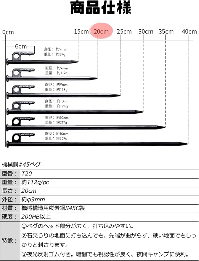 CAMPINGMOON Carbon Steel S45C Black Coating Tent Stake for Hard Ground (JP-T-20-8P)