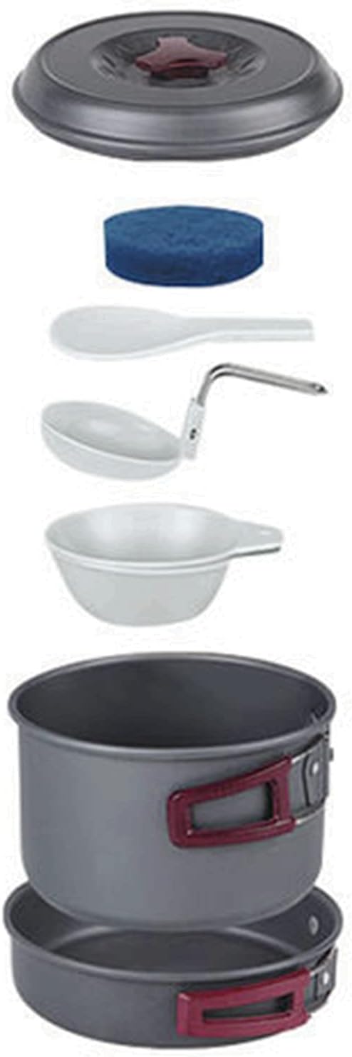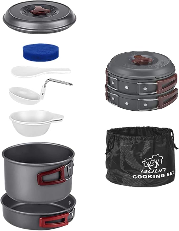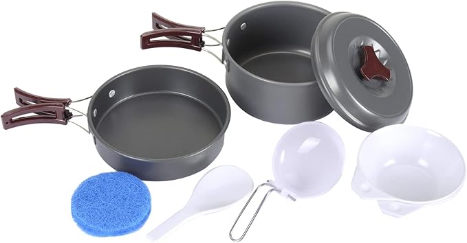 - 8PCS Camping Cookware——Our backpacking cooking set includes 1 pot with lids,1 frying pan, 2 BPA free bowls,1 BPA Free soup spoon, 1 rice ladle, and 1 cleaning sponge. You can enjoy delicious food with your lover anywhere.Best money ever spent.