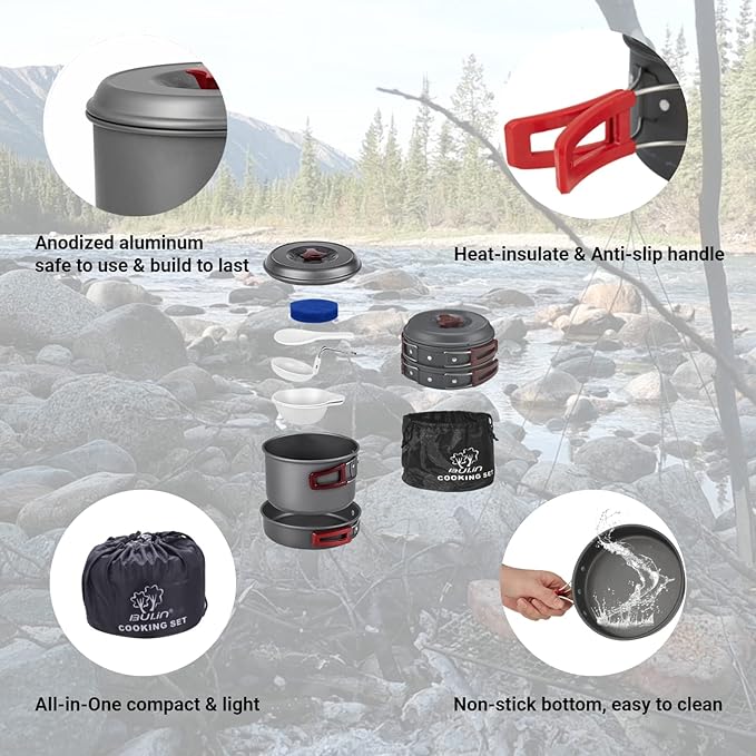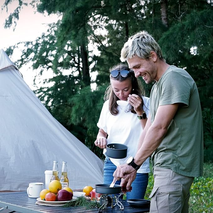 - Food-grade Material--The camping mess kit is made of safe, non-toxic aluminum for easy cleaning. Hard-anodized aluminum conducts heat quickly,stand high temperature, corrosion-resistant, rust-free,built to last. Heat-resistant handles to keep your fingers safe from the heat.Secure and anti-scald.