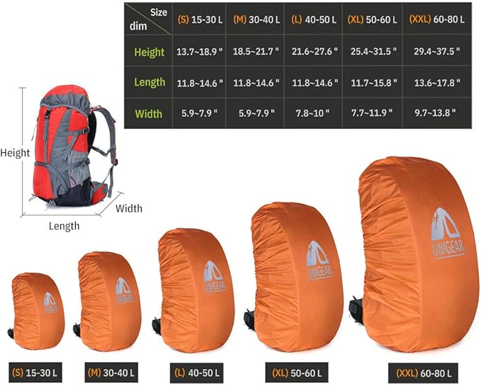 • Adjustable to Cover Your Backpack : Unigear rain cover features 2 vertical anti-slip buckle straps to adjust different backpack and pull the pack cover tight across the pack harness. Reinforce the elastic rim around your backpack to prevent sliding off. Comes in 5 sizes and colors to fit from 10L to 90L backpack