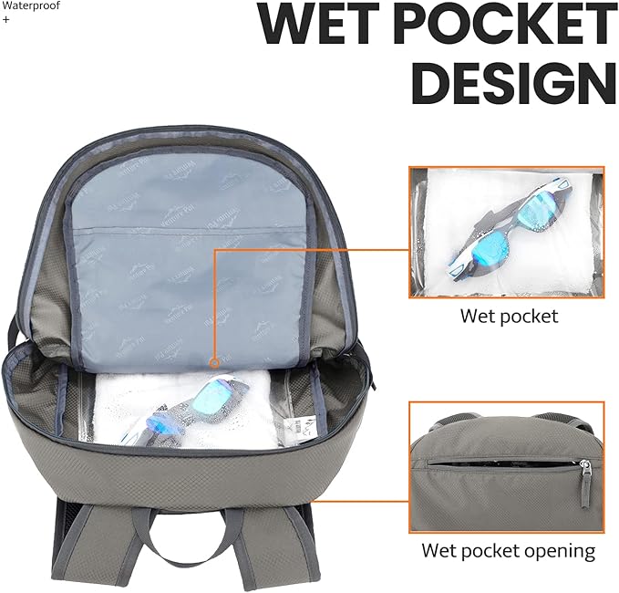 - Upgraded Wet Pocket Design: Venture Pal backpack stands out with more humane design for easy and convenient use. One waterproof wet pocket is added to the main compartment, a zipper on the back of this backpack which led to the internal wet pocket, to better separate sweaty clothes, towels or other personal things after swimming or taking exercise