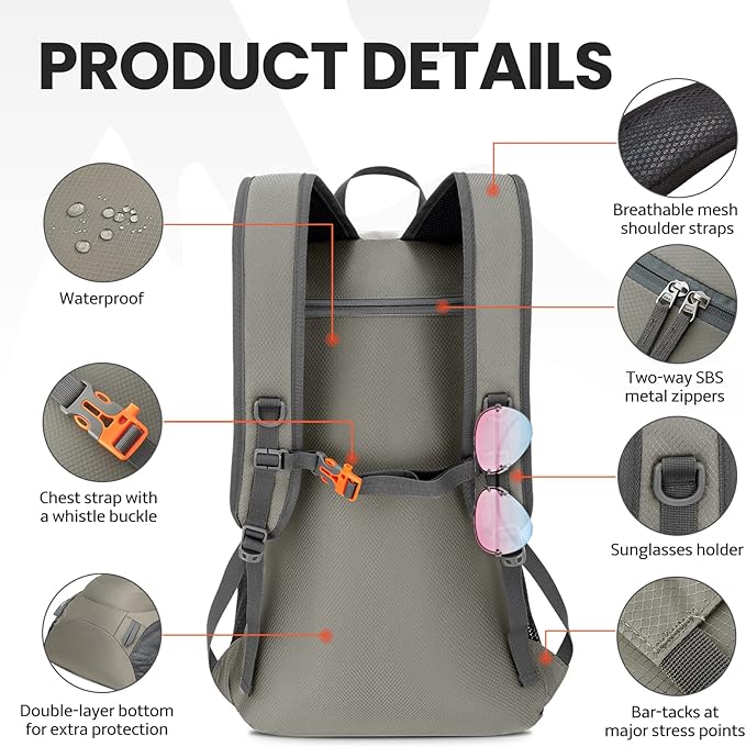 - Compact and Comfortable: It weighs only 1 pounds, can easily fold into its own pocket for storage,and unfold it when you need it. Perfect all-purpose carrying bag for traveling , easily fit in the luggage. Breathable mesh shoulder straps with plentiful sponge padding help relieve the stress from your shoulder. The chest clip with a whistle buckle work perfectly to distribute the pack’s weight and keep it steady and centered. A must have for sports , hiking and camping